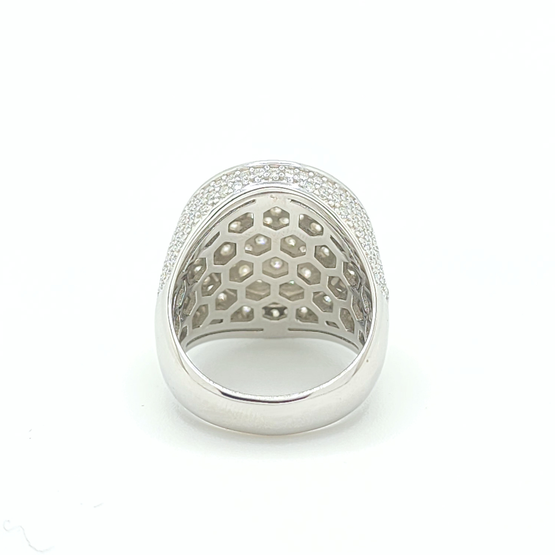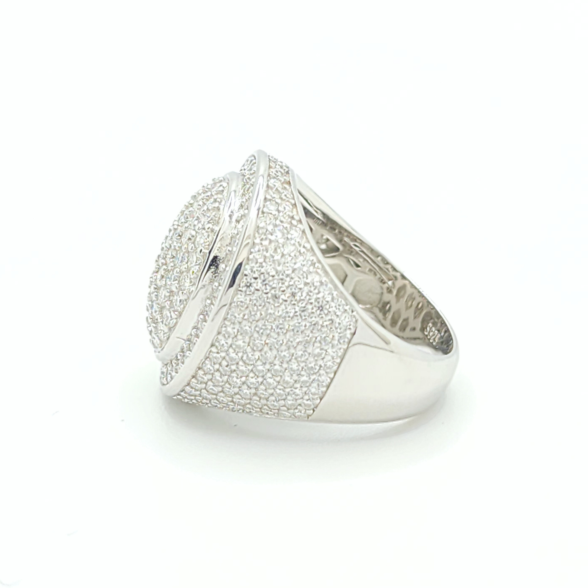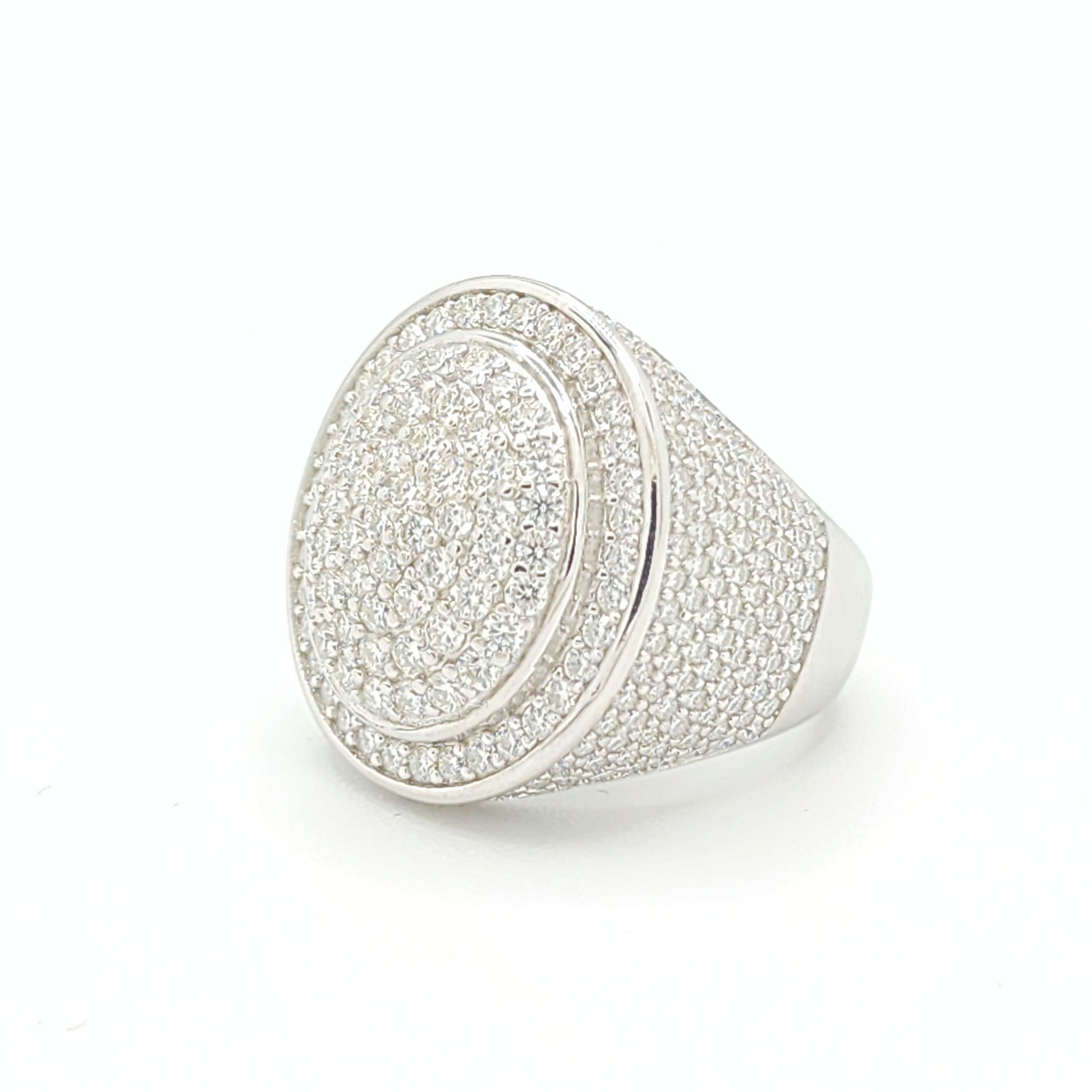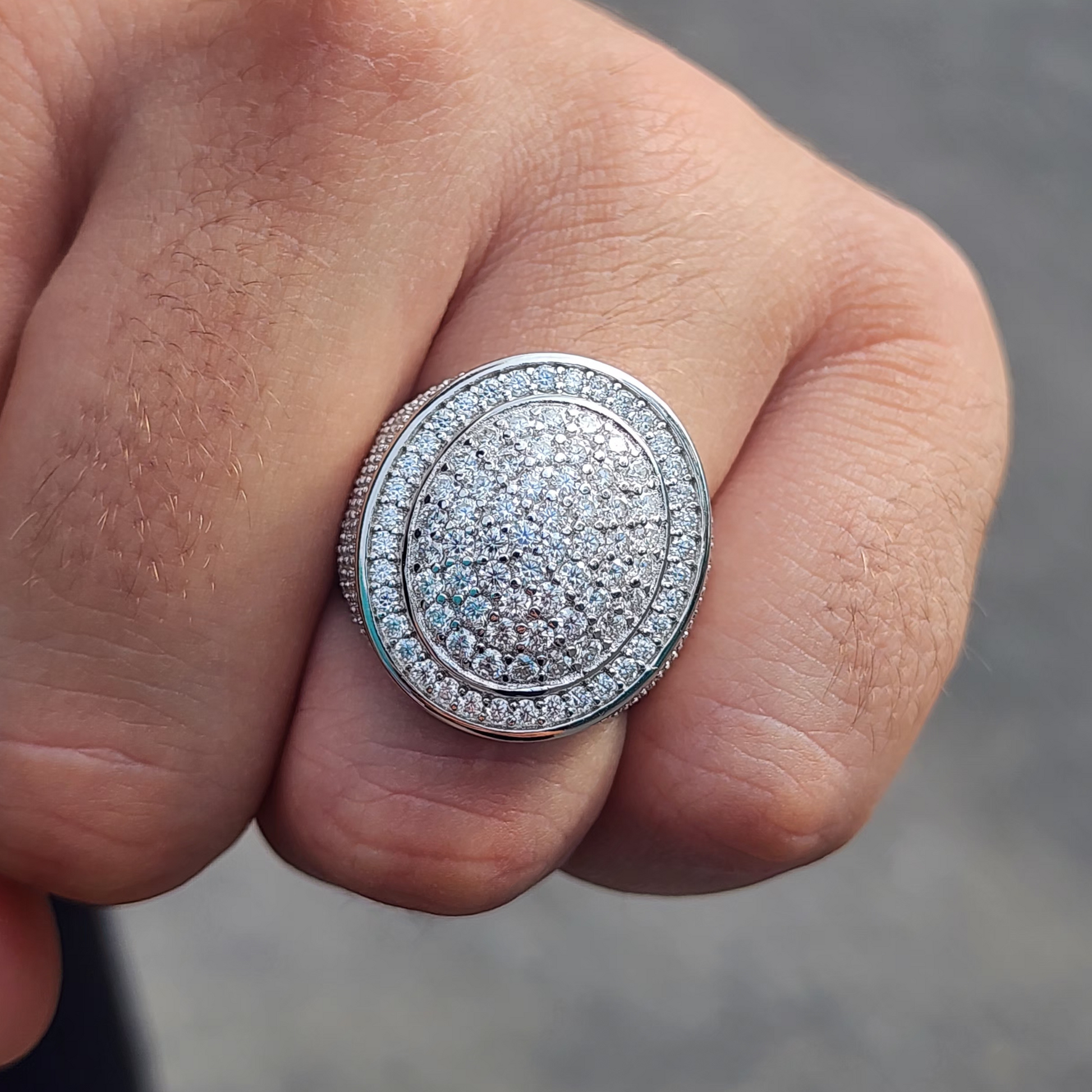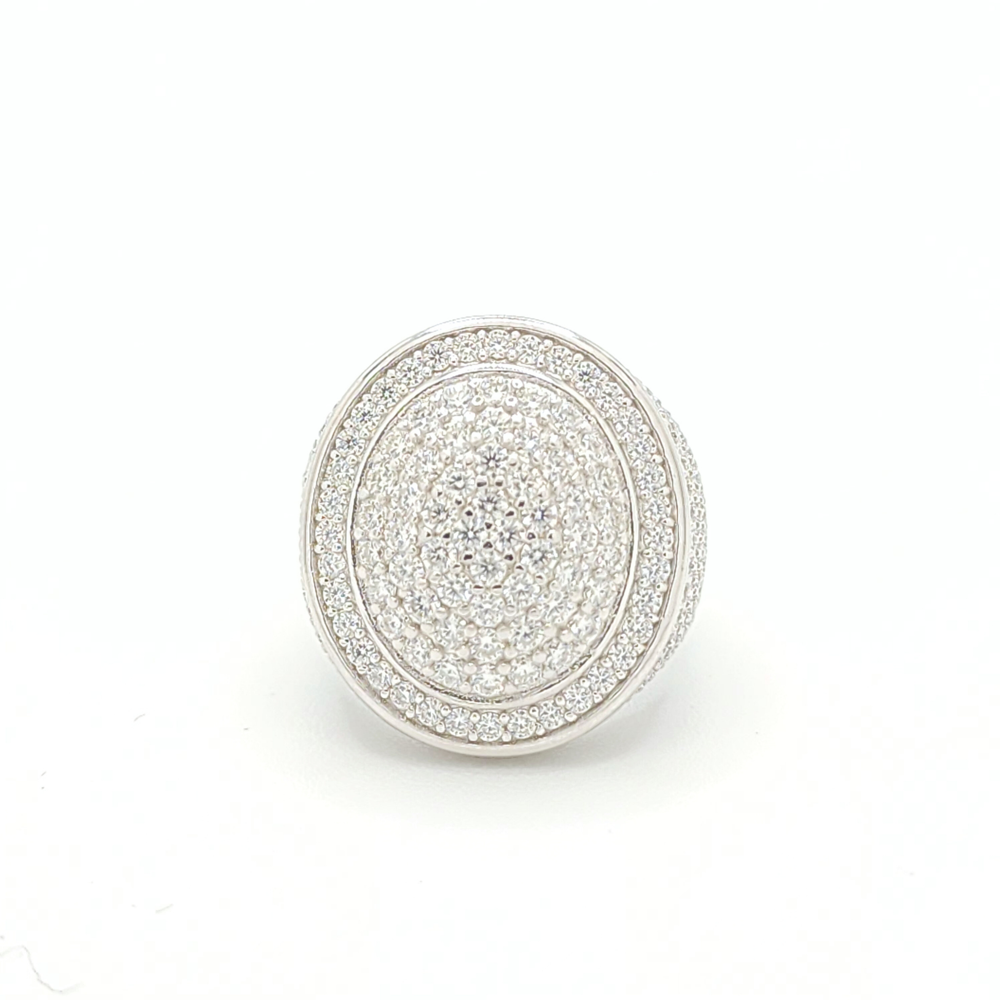 This men's moissanite ring is iced out with round cut, colorless (D-Color), VVS moissanite flawless diamonds, placed in a pave diamond setting. All of the diamonds on this moissanite ring pass the diamond tester.