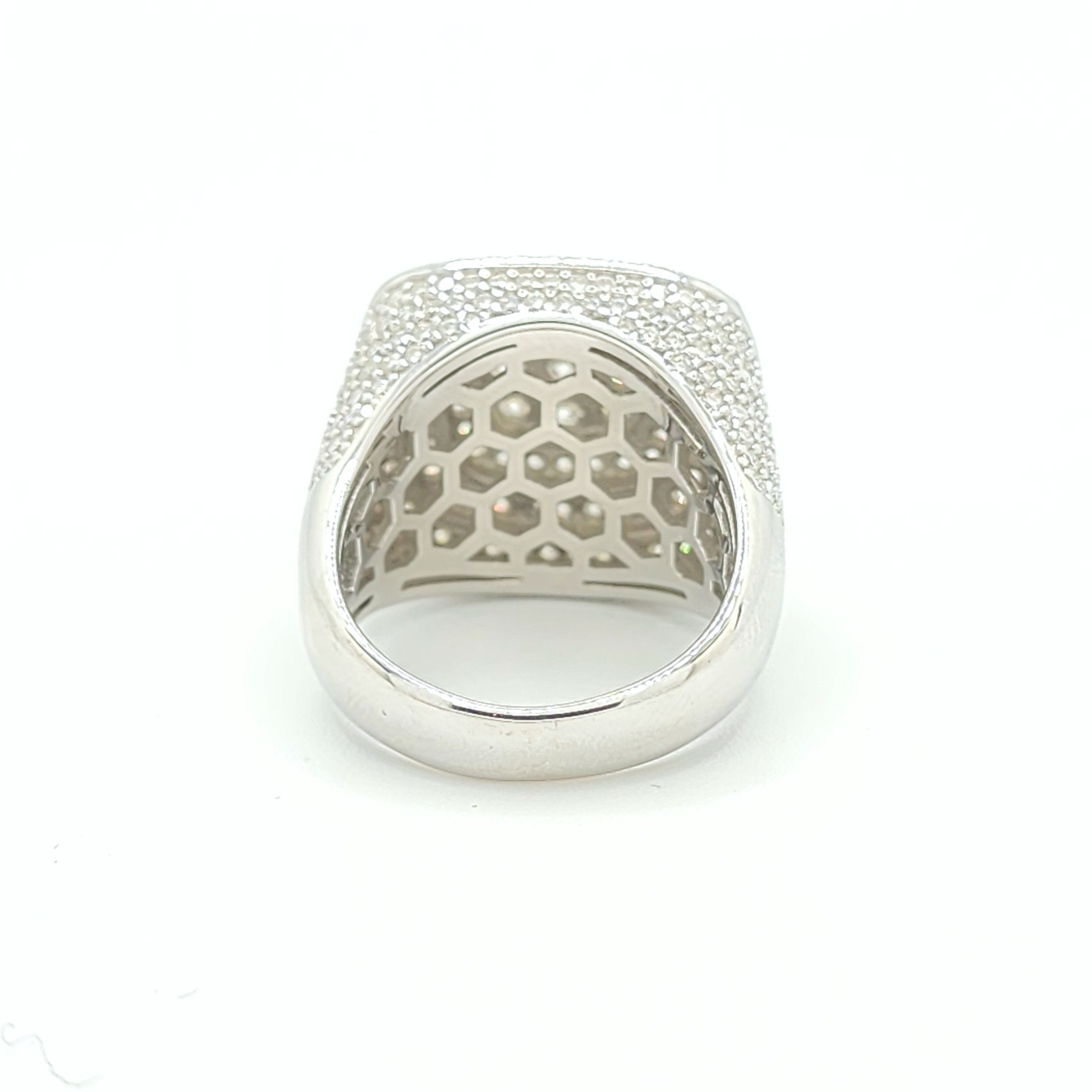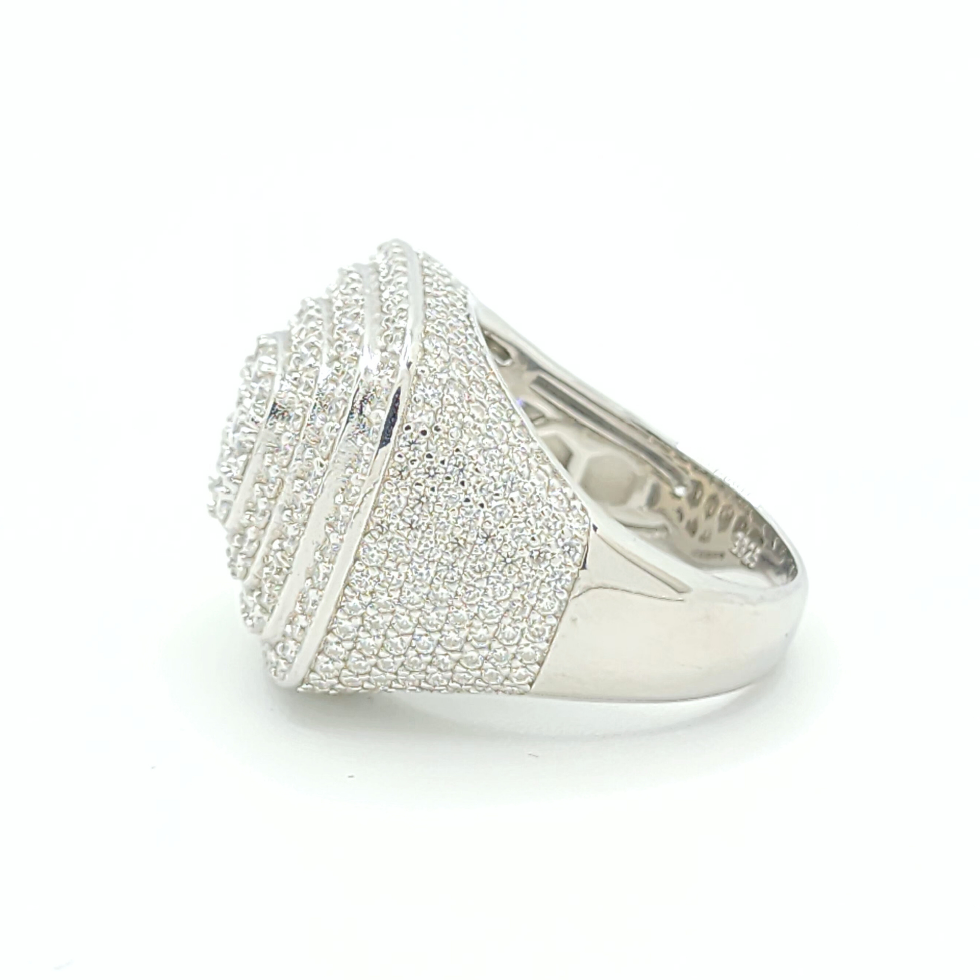 This men's moissanite ring is iced out with round cut, colorless (D-Color), VVS moissanite flawless diamonds, placed in a pave diamond setting. All of the diamonds on this moissanite ring pass the diamond tester.