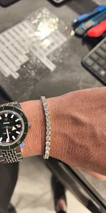 This moissanite tennis bracelet is iced out with round cut, colorless (D-Color), VVS moissanite flawless diamonds. All of the diamonds on this moissanite tennis bracelet are guaranteed to pass the diamond tester.