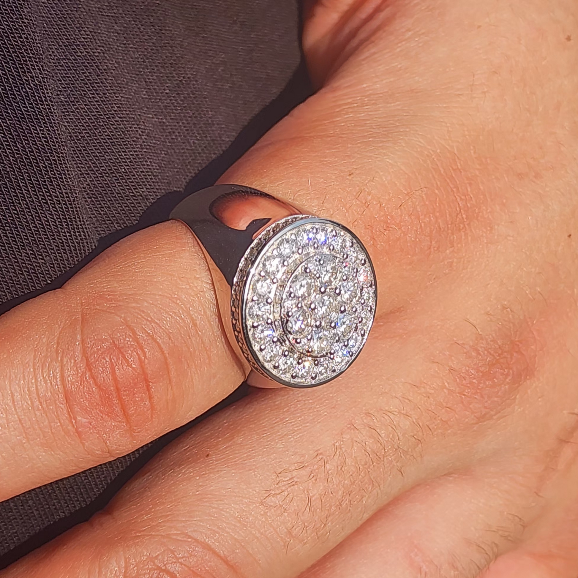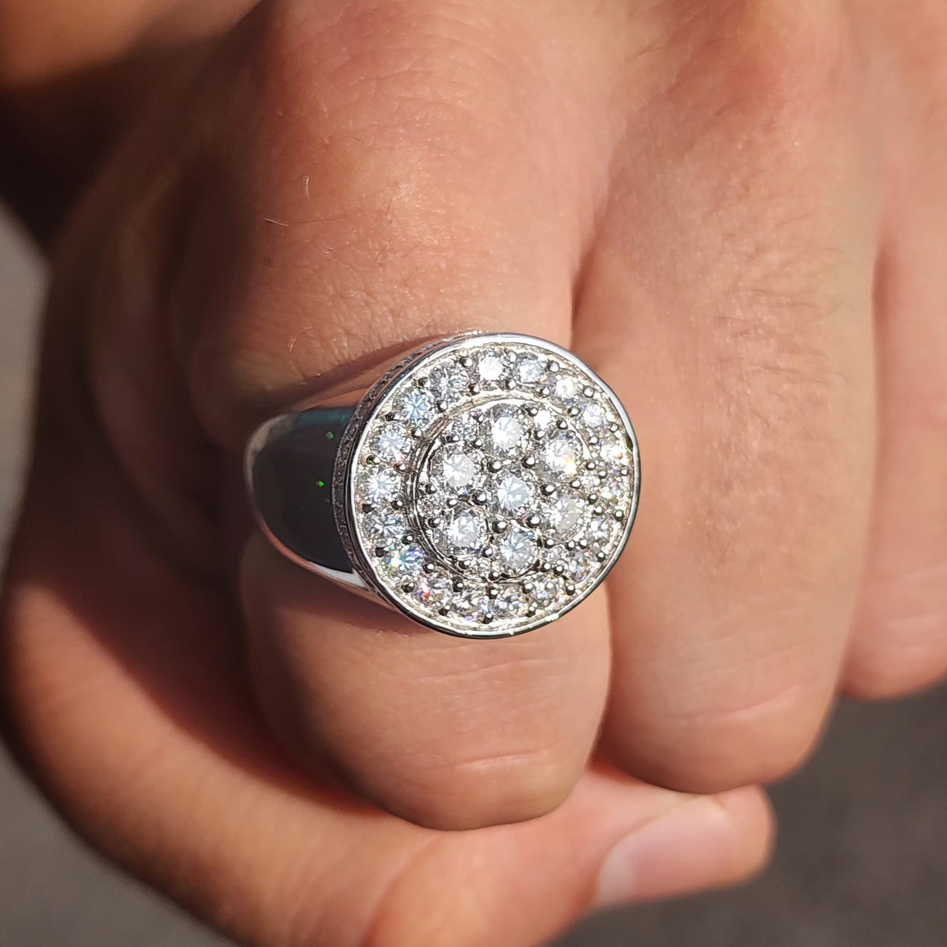 This men's moissanite ring is iced out with round cut, colorless (D-Color), VVS moissanite flawless diamonds, placed in a pave diamond setting. All of the diamonds on this moissanite ring pass the diamond tester.