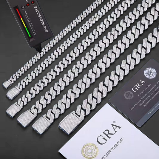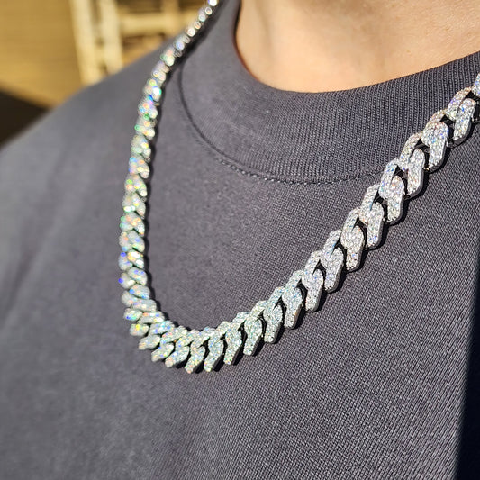 Crafted from solid 925 sterling silver, this Cuban chain showcases flawless VVS1 moissanite stones with a brilliant D-color shine.