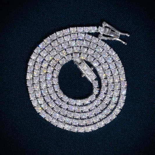 Crafted from solid 925 sterling silver, our tennis chain features flawless VVS1 moissanite stones with a D-color brilliance that rivals real diamonds.